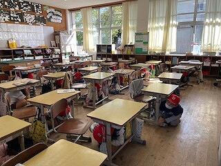 11月5日(火)に県民一斉防災行動訓練「みやざきシェイクアウト」を実施しました。県では「津波防災の日」及び「世界津波の日」を中心とした期間に、地震発生時の安全確保行動を県内全域で行う県民一斉防災行動訓練「みやざきシェイクアウト」を10年前から実施しています。学校だけでなく、職場や商業施設、病院などでも行われます。大規模地震の発生時にはまず自らの身は自らで守るという「自助」の考え方に基づいて「いのち」を守ることが大切です。本日三松小では、地震発生を伝えた後、地震の激しい揺れの効果音を約1分ほど流して、各教室で揺れがおさまるまで、机の下に隠れる練習をしました。どの学級も真剣に行動できました。