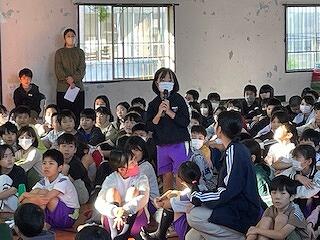 校長の話の後は、図書委員会の子どもや図書館教育担当の職員が、10月2日から11月11日まで実施される図書館イベントについて、お知らせしてくれました。