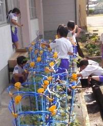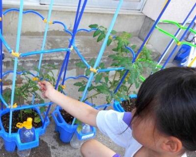 「先生、見て見て!」と2年生に呼びとめられました。子どもたちが紹介したかったのは、だんだんと育ってきたミニトマトでした。「実が大きくなったよ!」「ぼくも!」「わたしも!」と嬉しそうです。毎朝、水やりをしながら、野菜の成長を楽しみにしている2年生です。