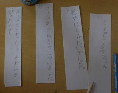 五感を使って、気づいたことをカードに書いたら、順番に並べて素晴らしい作文ができ上りました。