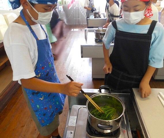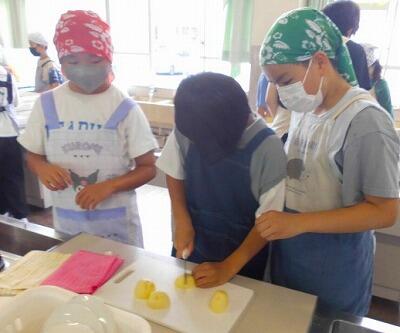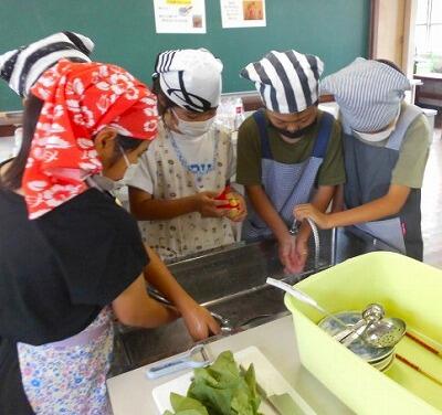 今週、5年生が3クラスとも調理実習をしました。前回の「お湯を沸かす」実習を活かして、今回は「ゆでる」実習です。栄養教諭の平良先生も一緒に、ほうれん草とジャガイモをゆでました。家で料理を手伝っていて手際が良い子もいれば、包丁を持つのは初めてでドキドキしながら野菜を切る子もいました。班ごとに協力して、みんな楽しそうに取り組んでいました。