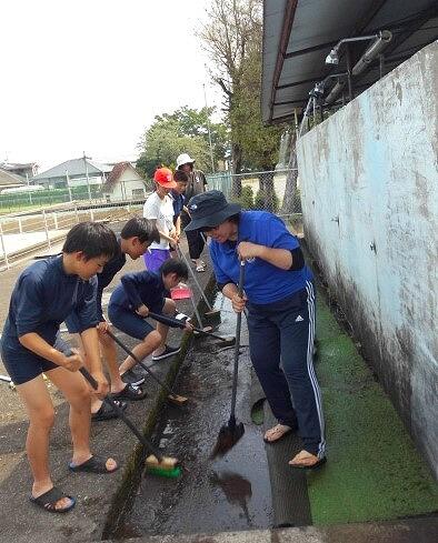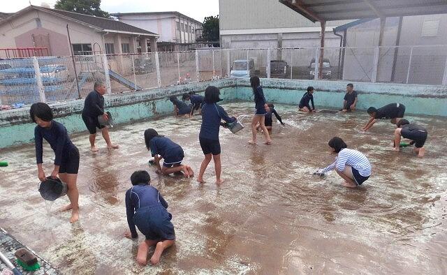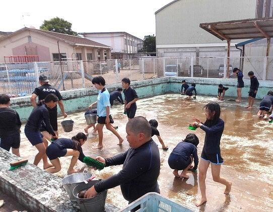 6月13日(金)は、1・2年生のプール開きに向け、6年1組の子供たちがプール清掃を行いました。小プールにたまった泥や藻などの汚れを、たわしやデッキブラシを使って落としました。みんなで協力して助け合いながら綺麗にしました。6年生が頑張って掃除をしてくれたプールで、みんな気持ちよく水泳ができます。(今年から、3年生以上は、市営プールで9月に水泳を行います。1・2年生だけ学校の小プールを使います。)