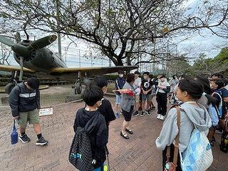 見学地1「知覧特攻平和会館」の様子です。施設の周りにある記念碑や銅像などをみたり、特攻で亡くなられた方の遺品をみたり、語り部の方のお話を聞いたりしました。自然と涙がこぼれた児童もいたようです。戦争の悲しさや平和の尊さを強く心に刻む時間となったようです。平和を祈ってみんなで織った千羽鶴もお贈りしました。
