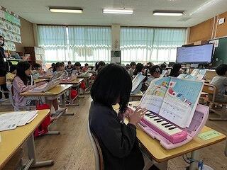 1年生が楽しそうに音楽の勉強をしています。みんな、歌をうたったり、鍵盤ハーモニカの演奏をしたりするのが大好きなようで、音楽の時間はみんな、にこにこしていますよ。