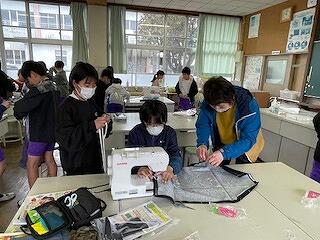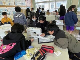 5年生は家庭科室で、エプロンをミシンでぬっていました。友だちと協力して、印からずれないようにまっすぐ縫おうとがんばっていました。