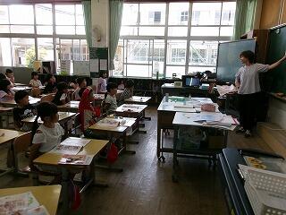 3年生は外国語活動で、いくつかある果物の絵を指さして、How many ( )?Two!などの英会話に楽しく取り組んでいました、音楽科では、リコーダーの正しい持ち方や穴のふさぎ方などをみんなでそろえて音を出していました。「右手でもって!0番をおさえて!、、、」きれいな音が響きわたっていました。