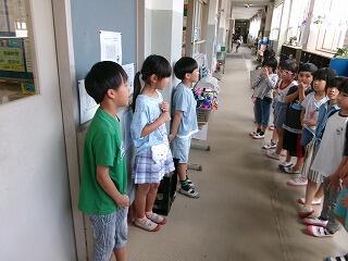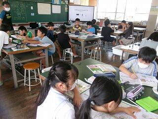 2年生は町探検のまとめをしていました。学校の周りの様子を探検し、気づいたことをワークシートにかいていました。今日は暑い日でしたので、汗をいっぱいかいていました。水筒のお茶もごくごく飲んでいましたよ!