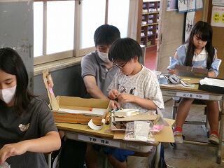 4年生は図工の工作で段ボールを使ってボールが転がるおもちゃをつくっていました。おもちゃファクトリーみたいでした。理科の学習では、ヘチマの苗の観察をし、理科ノートに丁寧にまとめていました。