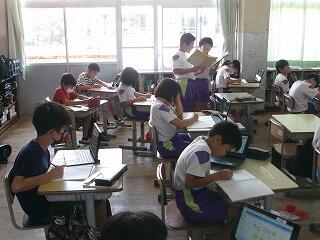 5学年国語科の学びの様子です。新聞記事の特徴を読み取り、読み手を意識した説得力のある文章の書きぶりなど、新聞のよさに着目して、自分たちの表現に活かそうとしていました。単元の漢字の学習にも意欲的に取り組んでいました。漢字のイメージが膨らむような話題で盛り上がっていました。