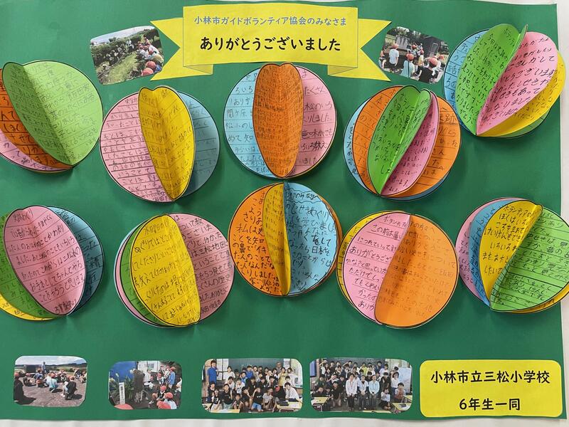 これは6年生のお礼の手紙です。先日行われた史跡めぐりの際にご指導いただいた小林市ガイドボランティア協会の皆様に対するお礼の手紙だそうです。「たくさんの学びがあったので感謝の気持ちです!」との担任の言葉。心がこもっていますね!きっと、時間をかけ1まい1まいメッセージを貼り合わせたのでしょう!