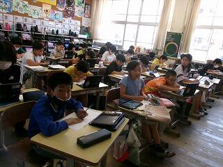 2年生は町探検のまとめをしていました。学校の周りの様子を探検し、気づいたことをワークシートにかいていました。今日は暑い日でしたので、汗をいっぱいかいていました。水筒のお茶もごくごく飲んでいましたよ!