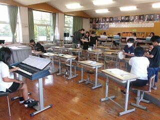 3年生は外国語活動で、いくつかある果物の絵を指さして、How many ( )?Two!などの英会話に楽しく取り組んでいました、音楽科では、リコーダーの正しい持ち方や穴のふさぎ方などをみんなでそろえて音を出していました。「右手でもって!0番をおさえて!、、、」きれいな音が響きわたっていました。