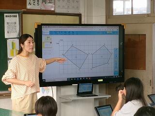 11月11日(月)5年3組で算数科の研究授業がありました。今まで学習した面積の公式を使って、四角形と五角形の面積の求め方を考える学習でした。子どもたちは、タブレットを使い、図形に線を書き入れて、図形を分けたり、つぎ足したりして、三角形や長方形をつくり、公式を使って求めようと頑張る姿が見られました。最終的には図を対角線で切り、底辺や高さ、縦横の長さを明確にすることで、公式を使って計算できることに気付くことができたようです。45分間、子どもたちがタブレットを文房具のように使いこなしながら学習が進んでいきました。