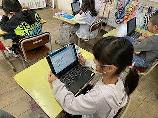 2年生は国語科の学習で電子紙芝居をつくったり、算数の振り返りの問題を解いて終わったら点検してもらったりしていました。