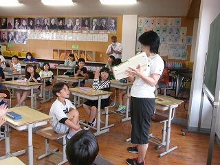 7月2日(火)、外国語専科の先生が初期研修として研究授業を行いました。新規採用職員は初期研修に2年間取り組むことが義務付けられており、研究授業を6回行わないといけません。今日はその記念すべき第1回目の授業でした。授業では最初にグリーティングをしました。グリーティングというのはあいさつのことです。今日の天気は?調子は?今日は何日?何曜日?などを伝え合い、外国語科の学習をする雰囲気づくりをしました。ALTのレイン先生の質問に子どもたちは自信をもってこたえていました。