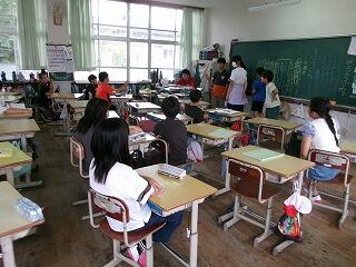 5年生は家庭科のテストの答え合わせをしていました。6年生は音楽隊の鑑賞教室の感想を書いていました。