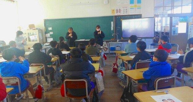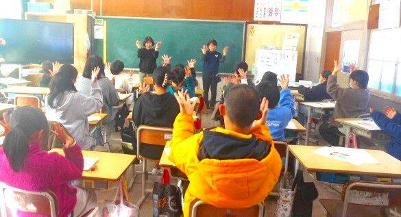 1月9日(金)、5年生が手話の学習をしました。西諸県地区手話派遣協会から6名が講師として来校され、挨拶の仕方やものの伝え方など、いろいろな手話を習いました。耳の不自由な方がどんなことに困っているか、耳の不自由な方々のためのバリアフリーなどについても説明もしていただきました。