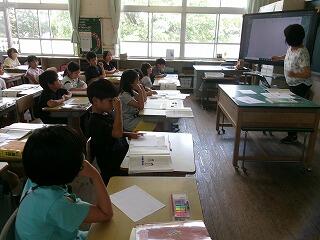 2年生は町探検のまとめをしていました。学校の周りの様子を探検し、気づいたことをワークシートにかいていました。今日は暑い日でしたので、汗をいっぱいかいていました。水筒のお茶もごくごく飲んでいましたよ!