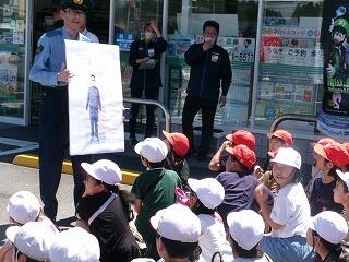 第2部では、3年生を対象に、校外に出て、道路で不審者に声をかけられたら、どうするかについて実技訓練を行いました。パターン1は、物陰にかくれていた大人の人に声をかけられるバージョン、パターン2は、車の中から声をかけられるバージョンです。不審者役の方はサングラスをかけ、見るからに怪しい大人という怖い感じの方でした。しかし、代表児童は、いかのおすしを守って、できるだけ早くその場を立ち去り、「お助けハウス」のステッカーのはられている「ファミリーマート三松中前店」にかけこむことができました。ファミリーマートの方々にとっても、かけこんできた児童にどう対処すればよいかの訓練として職員の皆様に対応していただきました。「どんなことをされたの?」「場所はどこ?」「相手の人の特徴は?年齢は?」「車のナンバーは?」など、店の方にいろいろ聞かれましたが、三松小の児童は落ちついて答えることができていました。代表児童以外の子どもはそのやりとりを観察して学びました。