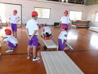 5年生は国語科の学習をしていました。先生の話を目を見てしっかり聞きながら、学びを進めていました。体育科では、跳び箱運動をしていましたが、開脚とびではなく、台の上をまわっておりる台上前転の練習をしていました。横で補助をしたり、技のアドバイスをしたりするなど、グループで教え合いながら学びを進めていました。