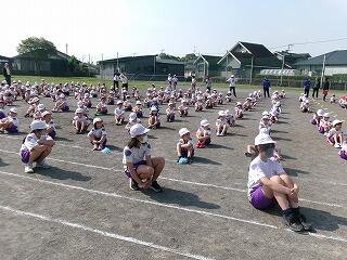 1年生は運動場で、まる~く輪になることや、マルモリダンスの練習をしていました。雲一つない青空のもと、気持ちよさそうに活動していました。