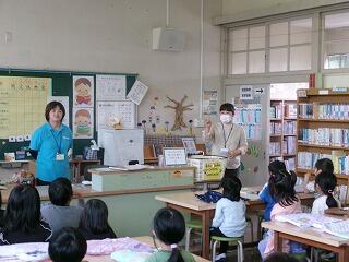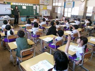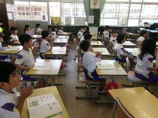 1年生は、ひらがなの学習をしていました。「あ」の書き方を習った後、「あ」のつく言葉をさがし、その文字の数だけ手をたたいて、発音していました。楽しそうでしたよ!