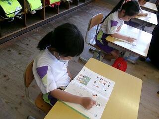 1年生は、ひらがなの学習をしていました。「あ」の書き方を習った後、「あ」のつく言葉をさがし、その文字の数だけ手をたたいて、発音していました。楽しそうでしたよ!