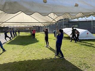被害を防ぐために、職員みんなで朝のうちに準備していたテントをすべてたたみ、屋根もとりはずしました。
