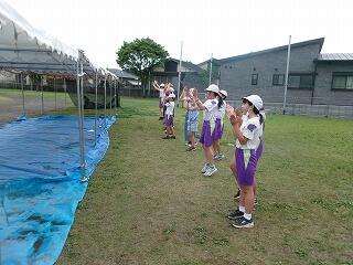 赤白、それぞれの団に分かれ、4年生が団技「台風の目」の練習をしていました。カラーコーンを早く回る方法や団でまとまって棒を跳び越えるコツなど、動きを確認し、何度も何度も試していました。どちらの団もとても上手になったようです。「赤白は敵ではなくライバル関係!楽しむこと、ルールを守ること、チームのみんなを応援すること」などを最後に話し合っていました。大切なことですね!