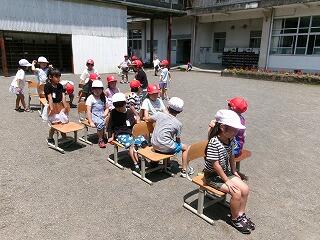 中庭に目を落とすと、椅子に座った1年生を発見しました!しかも、きちんと整列して!