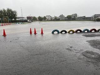 また、校庭や運動場は水浸しです。替えの靴下や濡れた靴下をいれる小さなビニル袋などあるといいと思います。