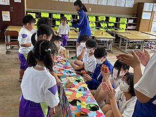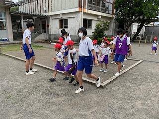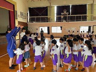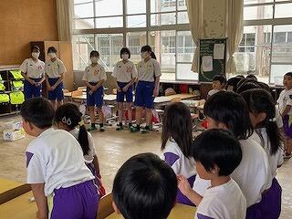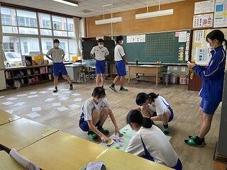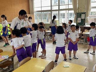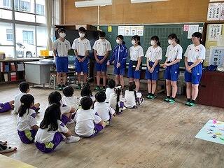 5月30日(木)、小学1年生と中学3年生の交流学習がありました。この日のために、三松中学校の3年生が、たくさんの準備をしてくれていました。「だるまさんがころんだ」「しっぽとり」「風船バレー」「なぞなぞ」「けいどろ」「ジェスチャー」などいろいろなゲームをクラスごとに行い、小学生も中学生も笑顔がいっぱい見られました。中学生のお兄さん、お姉さんはとってもやさしかったです。