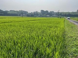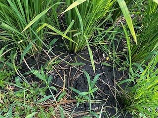 1株3~5本ずつ植えた苗でしたが、茎の数を数えると1本からどんどん茎が分かれて、今は本数が30本近くになっていました。苗の高さも70センチから80センチまで大きくなっていました。ふと地面に目を落とすと、「水がない!」「夏の暑さで水がかれた?えっ?」いえいえ、心配はいりません。中干後の水の管理は、水を入れる工程(湛水)と水を抜く工程(落水)を数日ごとに繰り返す「間断かんがい」を行うのだそうです。 これは、水分の供給と酸素の供給を交互に行うことで、さらに根をしっかり育てるためだそうです。「あ~、よかった!」
