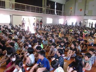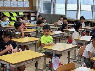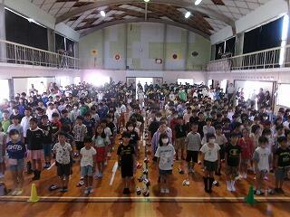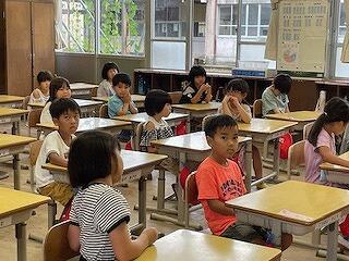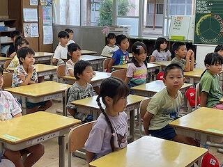 8月26日(月)、ひっそりしていた学校に子どもたちの元気な笑顔が帰ってきました!全校朝会の校長の話では、今日からの学校での日々は「はじまり」であり、「おわり」でもあると話しました。「はじまり」は言うまでもなく、夏休み後の学校生活の始まりを意味します。ここで大切なのは「生活のリズムを整えること」、特に「早寝・早起き・朝ご飯」にしっかり取り組もうと話しました。「おわり」は1学期の終わりを意味します。これから9月に入りますが、学期末のまとめのテストなどもあることから、「学習の振り返り・まとめをしっかりしよう」と話しました。それに加えて、いつもの「きらきら(人の話は目を見てきくこと)」「にこにこ(笑顔で友達と仲良く過ごすこと)」「ぐんぐん(バランスよく食べてよく運動して大きくなること)」の合言葉も合わせて、しっかりがんばろう!と話しました。