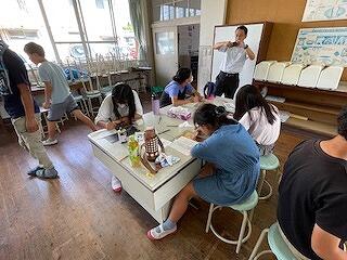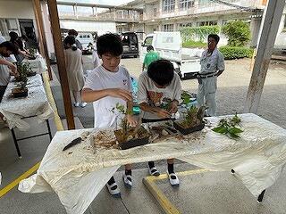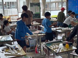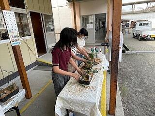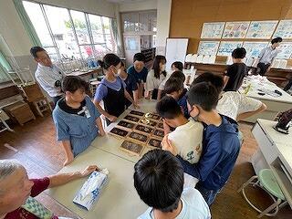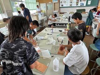 9月19日(木)6学年児童が「ものつくり体験教室」を実施しました。これは宮崎県職業能力開発協会という団体が行う出前授業で、小・中学校生を対象に、ものづくり体験を通して、ものづくりの大切さや楽しさなどの魅力を伝えることで、ものづくりに対する理解を深めてもらうことを目的として実施しているそうです。 実施方法としてはものづくりマイスター(造園・板金・染色)を学校に派遣して、ミニ造景、銅板による表札、オリジナルハンカチをつくります。当日は6学年児童を3つのグループに分け、活動に取り組みました。