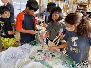 ハンカチづくりの様子です。好きな型枠を選んでハンカチの上に、特殊な絵の具でぬっていきます。同じ型を選んでも、色付けはそれぞれで、オリジナルのハンカチに仕上がっていました!