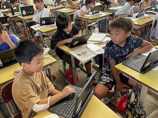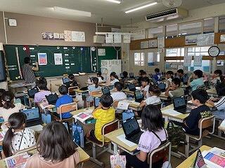 9月19日(木)、本校では1人1回は研究授業を行い、その実践を通して、授業の腕をみがく取組をしています。今日は3年生が国語科の授業をしました。「ポスターを読もう」という単元でした。同じイベントについて作成された2つの異なるポスターを見比べて、そのよさを各自で調べてタブレットにまとめ、それをグループや全体で伝え合って、カテゴリー別に整理します。そして、それぞれのポスターが誰を対象に何の目的でつくられたものなのかを探り当てる学習内容です。本校は授業中に児童相互の「対話」を積極的に取り入れ、考えを深める方法について全職員で研究を進めていますが、今日の授業でも、子ども同士が少人数の中で自分の考えを生き生きと伝え合ったり、全体の話し合い場面でも、次の発表者を児童があてあいながら、発言をつなぎ、話合いを深めるなどのシーンが随所に見られました。先生と子どもが一体となってつくりあげる授業でした。いい勉強になりました。