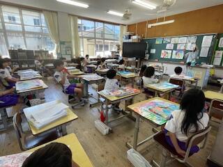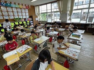 2年生は、算数のテストや図工科の読書感想画の色塗りをしていました。テストはすごく集中して取り組み、全体的によくできていました。結果を楽しみに!感想画は色塗りの工夫が見られました。