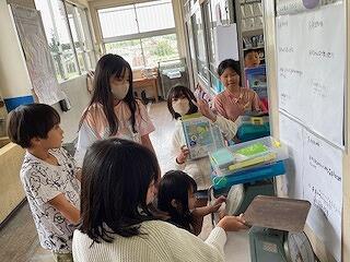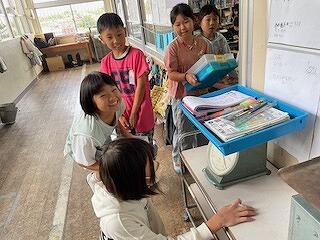 3年生は算数科の「重さ」の学習で、1kg=1000gをならい、身の回りにあるもので1kg以上になるものをはかりで調べていました。あまりに重い荷物を台にのせたため、10kg以上になり、針が1周してしまった子どももいました。