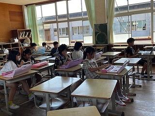 5年生は、家庭科の裁縫や算数科の分数「通分」の学習をしていました。裁縫は玉止めや玉結びなど、細かい手作業が伴いますが、参観日にお家の方々の手ほどきを受けたせいか、楽しそうに、そして上手に縫えていましたよ。算数科は、公倍数の学習をもとに、ひとしい分数をつくることができていました。