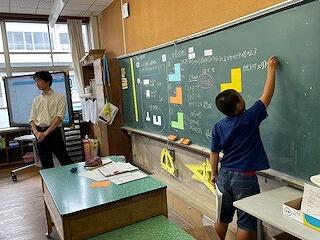 10月22日(火)に、4年算数科「面積」の研究授業がありました。「複合図形の面積はどうやって求められるのだろう」というめあてで学習を進めていきました。子どもたちはこれまで学習してきた面積の公式を使って、L字型(階段型)の図形をタブレットで縦や横に分けて別々に求め、後からたす方法で求めることができていました。最後に、欠けている部分を継ぎ足して長方形をつくり、後から継ぎ足した部分を引く方法で解いた子どもの式だけを示し、この方法は図形をどのように加工して求めたものなのかを個人やペアで考えていきました。複雑な図形は、分けたり、継ぎ足したりして求めることができることを気付くことができた授業でした。