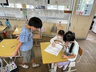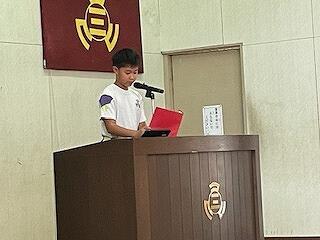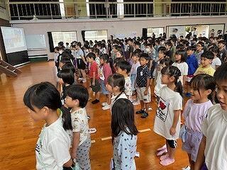 3年生のきこさんは割り算と友だちと仲良くすること、英語の勉強を頑張れたので、2学期は発表と右一静歩をがんばりたいと発表してくれました。5年生のあおいさんは下級生のお手本となるやさしい行動ができたり、宅習をがんばることができたりしたので、2学期は1分前着席や忘れ物0、タイピングを頑張りたいと発表してくれました。