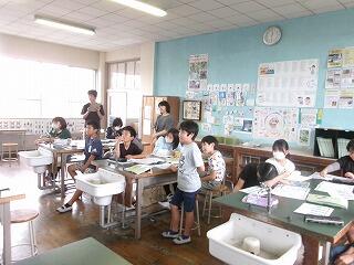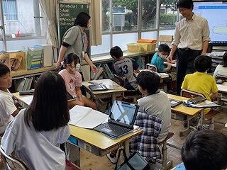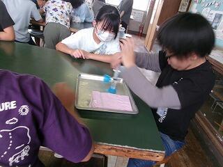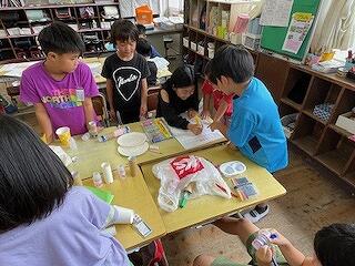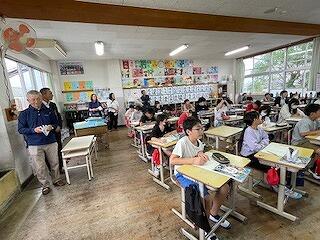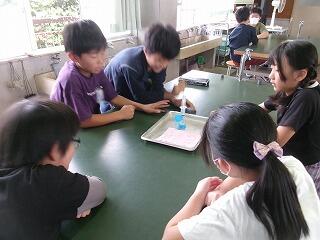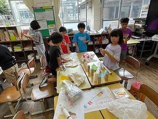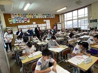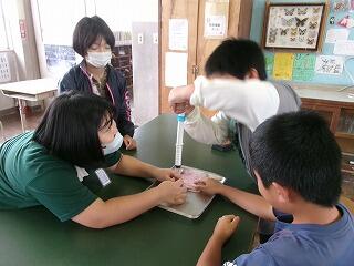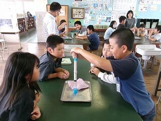 10月21日(月)、4年理科の研究授業がありました。「空気と水」の単元で、学習問題は「水も空気と同じようにおしちぢめることができるか」でした。子どもたちは、つつや注射器に水を入れ、一方を板に押し付けて、水の体積が縮まるかどうかの実験をグループごとに行いました。そして、水は空気とは違い、推し縮めることができないことにみんな気付くことができました。最後にスペシャル問題として2問、問題が出され、これが大いに盛り上がりました。スペシャル問題1は「つつに空気と水が半分ずつあるとき、ピストンで推し縮めることができるか?」スペシャル問題2は「スペシャル問題1のつつを逆さまにしたとき、ピストンを押し縮めることができるか?」でした。子どもたちは結果を予想し、グループで根拠をもとに対話しました。そして、映像や先生の実演を通して、空気と水が半分ずつ入ったつつや注射器は、空気が入った分だけ、押し縮められることに気付くことができました。今日の研究授業は知的好奇心をくすぐる学習内容で、閉じ込めた空気や水に、力を加えたときの違いについて見出し、根拠ある予想や考察を自分の言葉で表現することができた授業でした!
