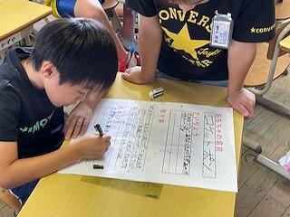 カナ変換ではなく、ローマ字変換で文字を打つ練習です。子どもたちはタブレットを使った学習が大好きで、みんな夢中になって取り組んでいました。私が子どものころは、タブレットどころかパソコンもない時代で、三本線のひかれたノートで、ひたすら書いて覚えたものです!今は便利ですね!