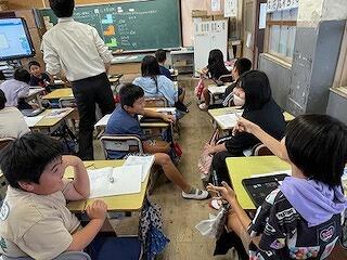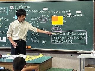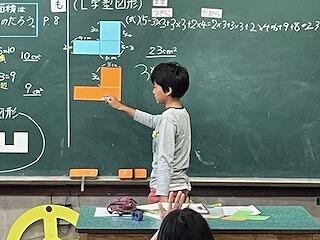 10月22日(火)に、4年算数科「面積」の研究授業がありました。「複合図形の面積はどうやって求められるのだろう」というめあてで学習を進めていきました。子どもたちはこれまで学習してきた面積の公式を使って、L字型(階段型)の図形をタブレットで縦や横に分けて別々に求め、後からたす方法で求めることができていました。最後に、欠けている部分を継ぎ足して長方形をつくり、後から継ぎ足した部分を引く方法で解いた子どもの式だけを示し、この方法は図形をどのように加工して求めたものなのかを個人やペアで考えていきました。複雑な図形は、分けたり、継ぎ足したりして求めることができることを気付くことができた授業でした。