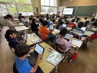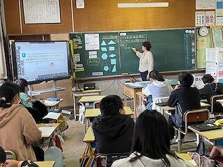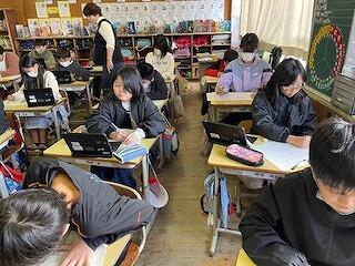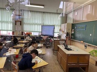 6学年はタブレットで調べ物をしたり、外国語科の学習で、いろいろなペアで英会話をしたり、算数科の拡大縮小のまとめの問題をしたりしていました。