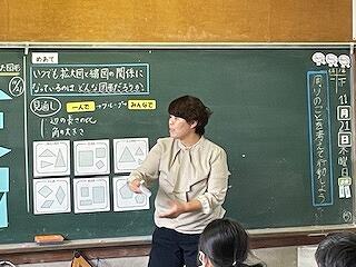 11月21日(木)に6学年で算数科の研究授業がありました。これまで学習した図形のうち、正方形、長方形、ひし形、二等辺三角形、正三角形、正五角形を取り上げ、拡大、縮小の関係にあるか、ないかを分類していきました。授業の冒頭で、6つの図形の定義を全体で押さえた後、タブレットを使って、拡大・縮小の関係にあるかないかを各自で調べていきました。拡大縮小の関係にある図形は、形が同じこと、つまり、図形を構成する辺の長さの比が等しいこと、すべての角の大きさが等しい時に成立します。この条件にあてはめながら、分類し、その理由まで考えた後、ペアや全体で交流して考えを深めていきました。最終的に、拡大・縮小の関係にある図形は、正三角形、正方形、正五角形であることに気付き、すべて名称に「正」がつくことも確認することができました。流石(さすが)6年生!と叫びたくなる授業でした。