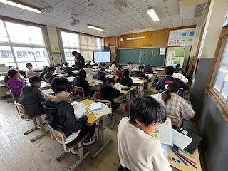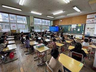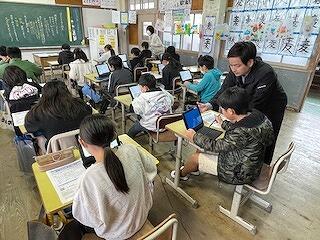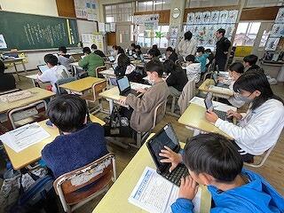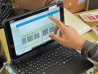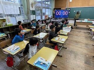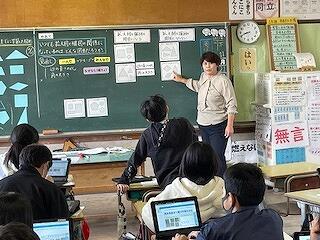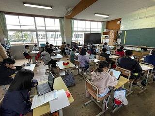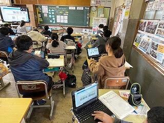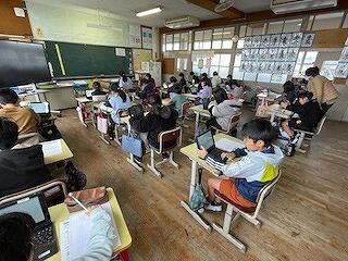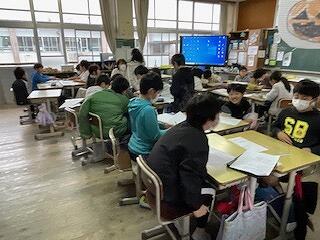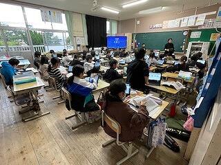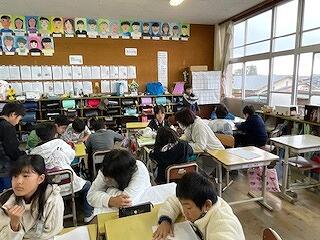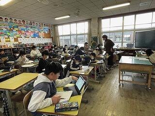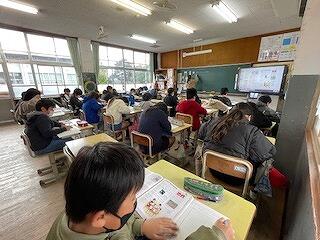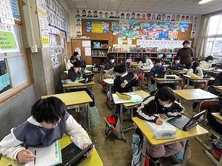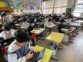 3学年はタブレット使って、これまでの復習として、社会科のドリル問題に取り組んでいました。自分のペースで問題を解き、〇をたくさんもらっていました。