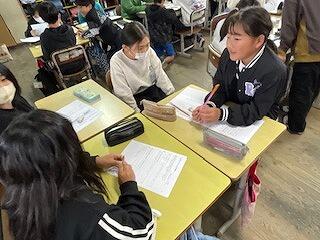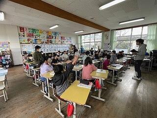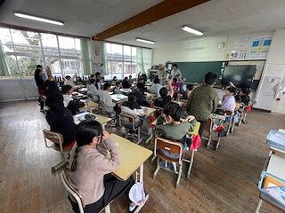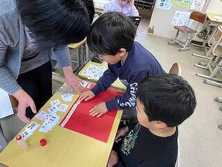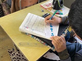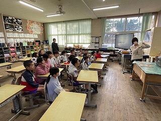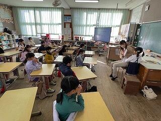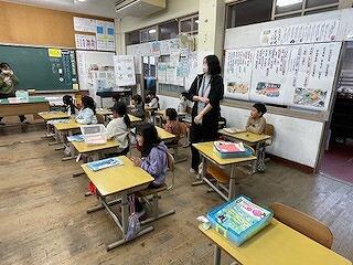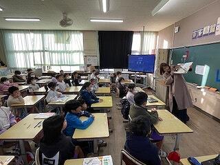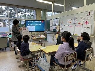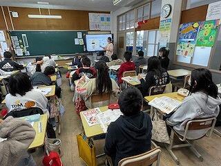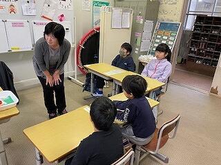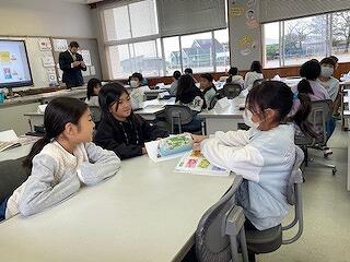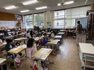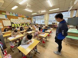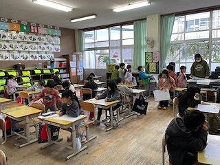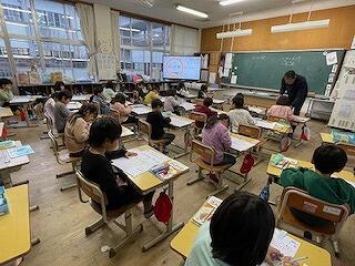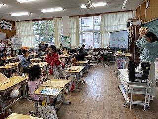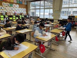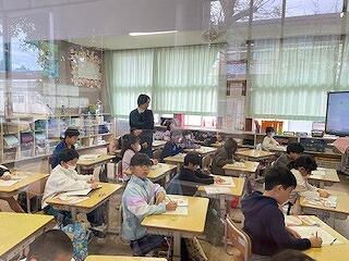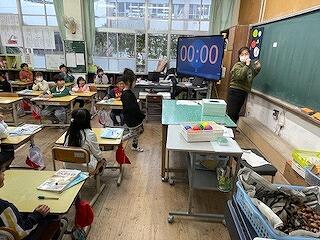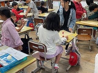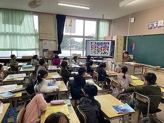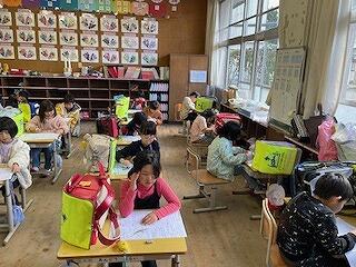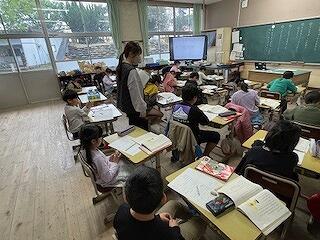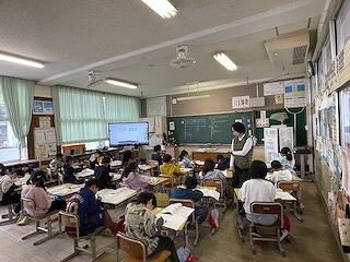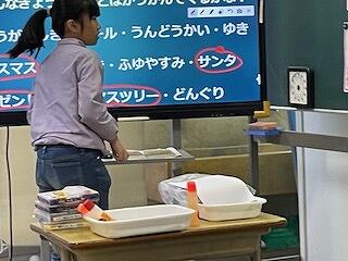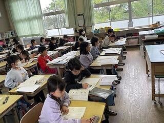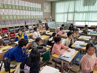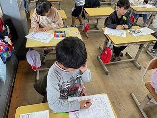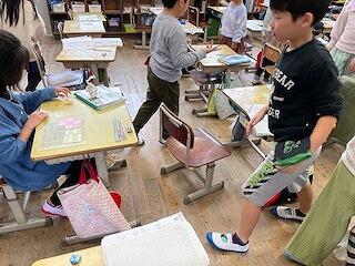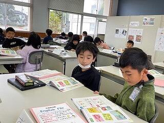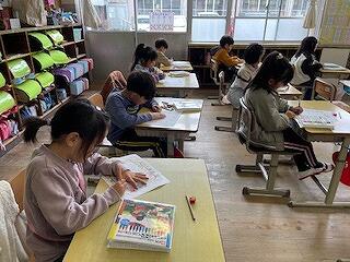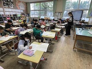 3年生は、国語科で漢字の意味の学習をしていました。例えば、「はははははじょうぶです。」を意味が伝わるように漢字をつかって表したり、キシャ(記者、汽車)、カジ(家事、火事)など同音異義語を使い分けて文をつくったりしていました。外国語活動では世界のいろいろなグリーティングカードをみながら、誰に贈りたいかを話し合っていました。(かぞく~!)と発言する声が多かったです。