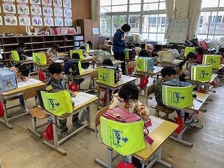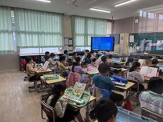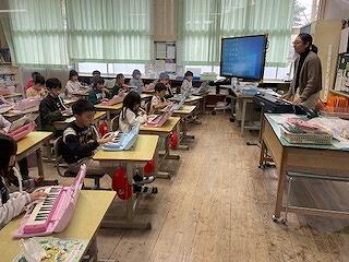 2年生は図工科で、紙袋に新聞紙などをつめて形をつくり作品をつくっていました。算数科では、いくつかの図形の中から三角形や四角形を見つける学習をしていました。音楽科では楽しそうに先生の伴奏に合わせて、鍵盤ハーモニカをひいていました。